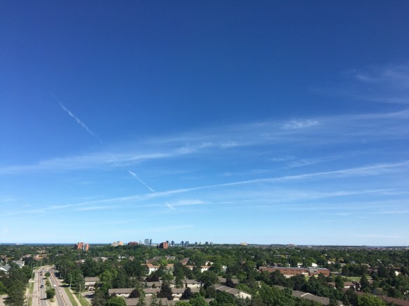 I can see about 50 miles of horizon out my floor-to-ceiling windows. The view’s horizon is the shore of Lake Ontario. The photo above does show a line of darker blue that is the water. In the east, I can see the C.N. Tower in downtown Toronto and in the west, I can see the height of the Niagara Escarpment, the only height in this flat land. I particularly love Rattlesnake Point there and longed to go there for the long weeks of shut-in.