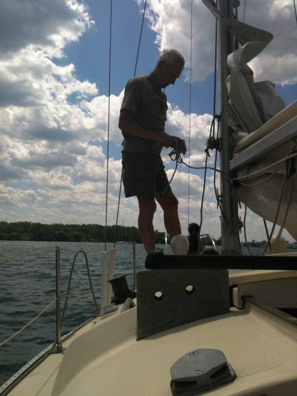 I used to live in a ground floor apartment in a triplex. There were bushes and flowers, trees and birds at my level. Now my view is of doll house roofs and tree tops. And sky. I have taken to noticing the change in light throughout the day. At the moment the ground is all green kodachrome while the sky is light blue fading to white over the lake. I have watched a line-squall suddenly tear through with floods of rain and tree-bending winds. I have watched its darkness leave just as suddenly to lash the city. I have remembered the names of clouds from my sailing days and the weather they presaged.