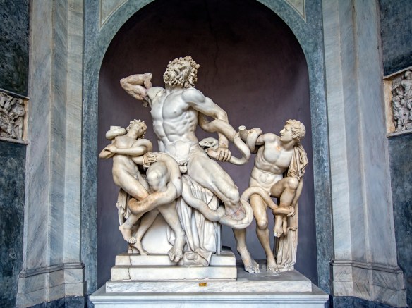 Laocoon, priest of Poseidon, tried to change the history of Troy by exposing the ruse of the wooden horse, in which were hidden Ulysses and his Greek cohorts. Poseidon sent sea serpents to destroy him and his sons. It was fated that the Greeks would prevail and Troy would fall.